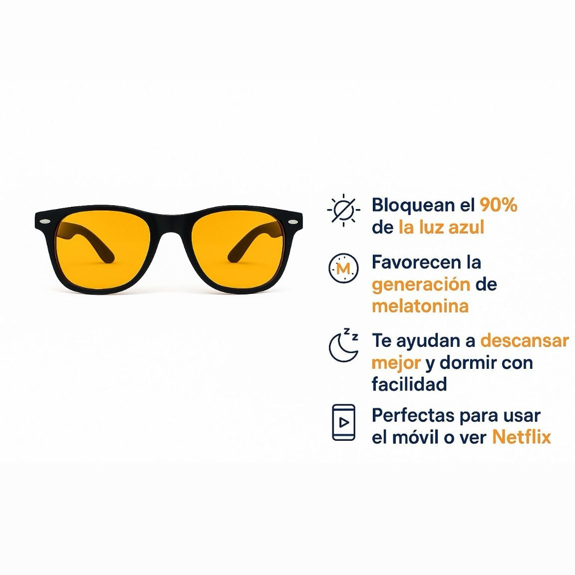 Esta combinación es perfecta para utilizar las negras durante el día, y las naranjas 2 horas antes de dormir, para así bloquear el 90% de la luz azul y que tu cuerpo pueda generar melatonina y así descansar antes y mejor.
